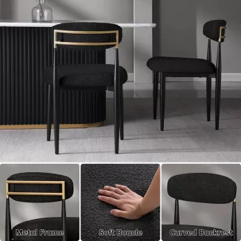 Set of 6 Black Boucle Dining Chairs with Curved Backrest and Metal Legs