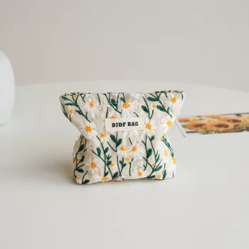 White Daisy Embroidery Makeup Bag – Portable Coin Purse, Key & Cosmetic Case